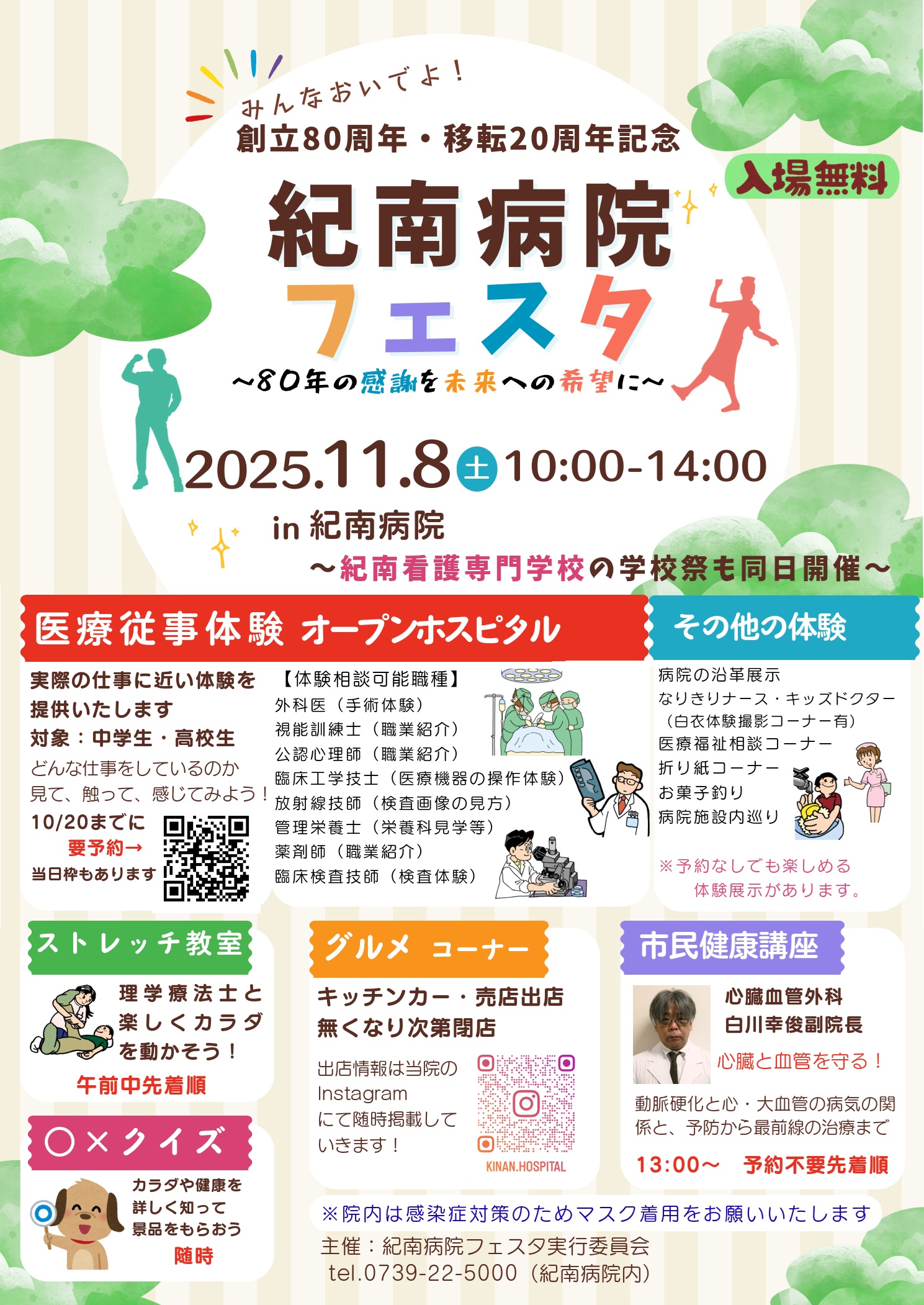 この度、紀南病院創立80周年、移転20周年を記念して紀南病院フェスタを開催することといたしました。 紀南病院では地域のみなさまに当院のことをもっと知ってもらうために、なにより将来の地域を担う世代の方に医療従事体験を通じて、医療に興味を持っていただきたいと考えています。皆様ぜひお越しください。 オープンホスピタルの体験ブースについては、中学生・高校生を対象とさせていただきます。 予約フォームからお申込みをお願いいたします。